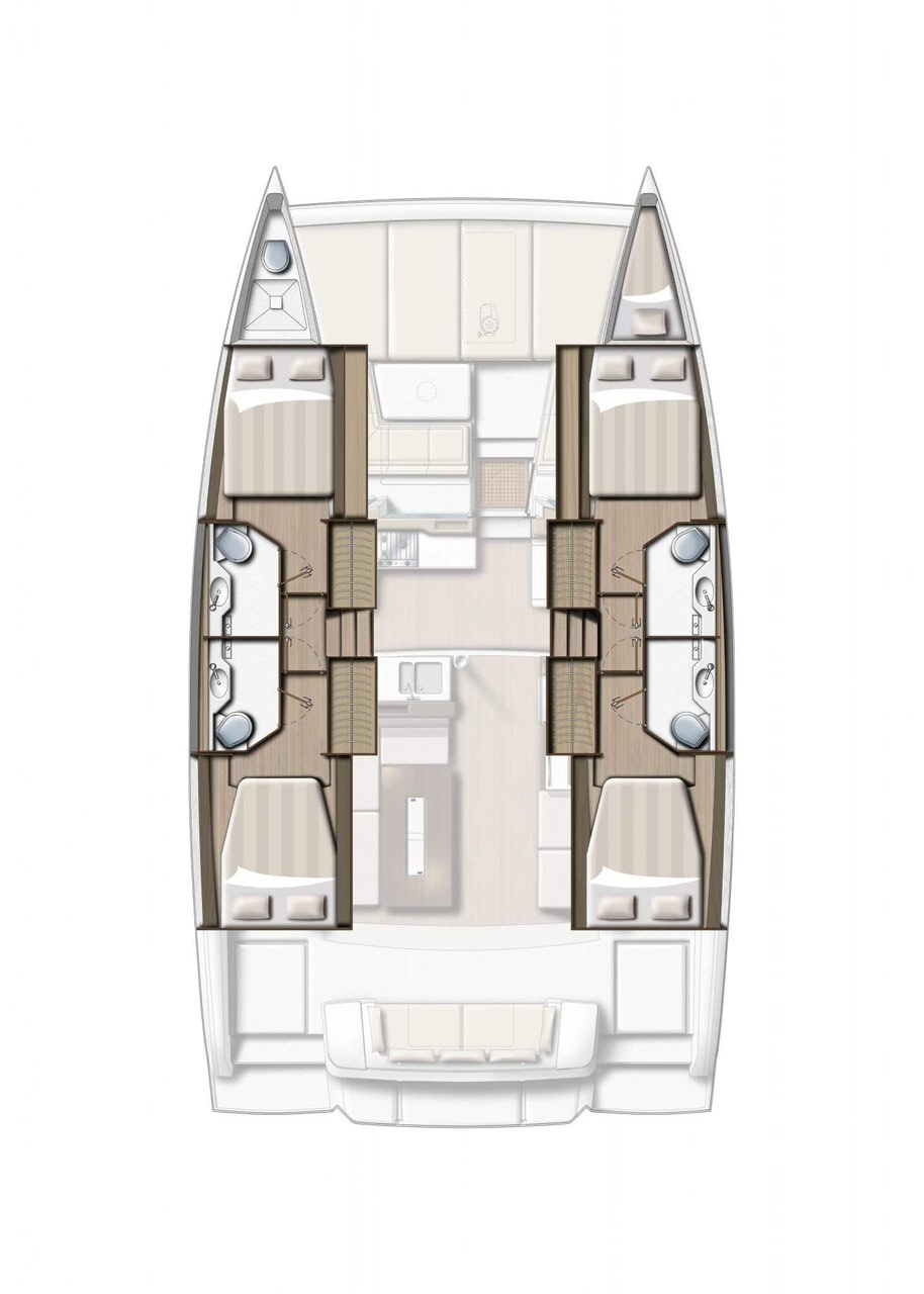 Na razini glavne palube nalazi se salon i kokpit koji čine jedinstven prostor kada se podignu velika pomična vrata. Velika, potpuno opremljena kuhinja smještena je lijevo u prednjem dijelu salona, a pozadi se nalazi garnitura za sjedenje. Iz salona je moguće pristupiti prednjem kokpitu kroz vodonepropusna vrata. Ispod palube, u trupovima, smještene su bogato opremljene kabine, a za detaljan raspored pogledajte Layout sekciju.