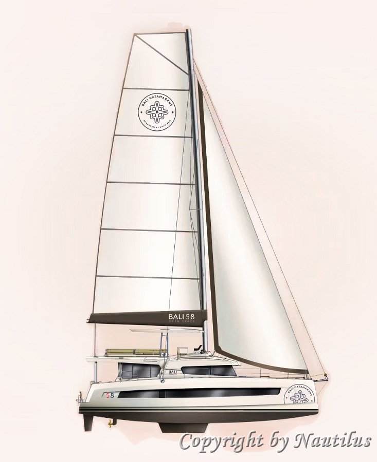 Bali-58-Fly-Layout Pianta del Flybridge Piano velico e profilo Pianta ponte principale Configurazione cabine