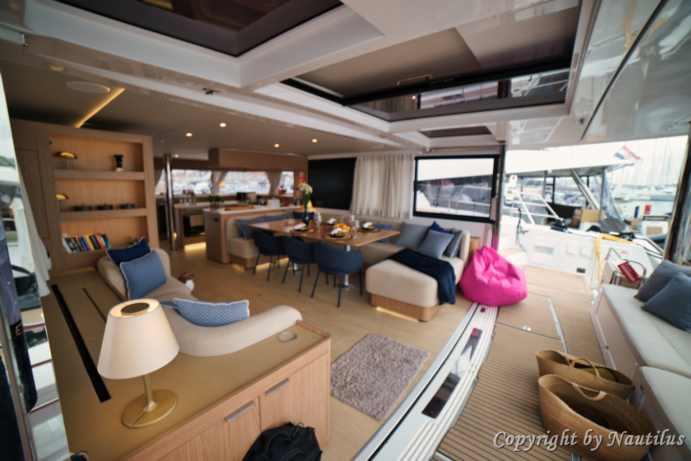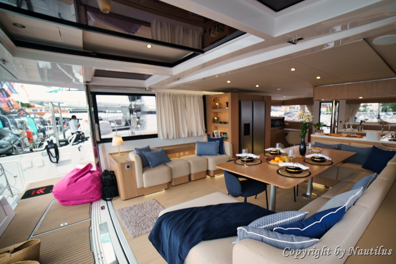 Bali-58-Fly-Salone Concetto Bali Open Space Interni di lusso Vista panoramica dal salone Zona pranzo Lounge relax Cucina Gourmet Bali 5.8 Design della cucina Frigorifero americano Tavolo da carteggio Timoneria interna Accesso alle cabine Cucinare a bordo Cucina Open Space Atmosfera serale Isola centrale Finestra anteriore Visione passante Design d'interni
