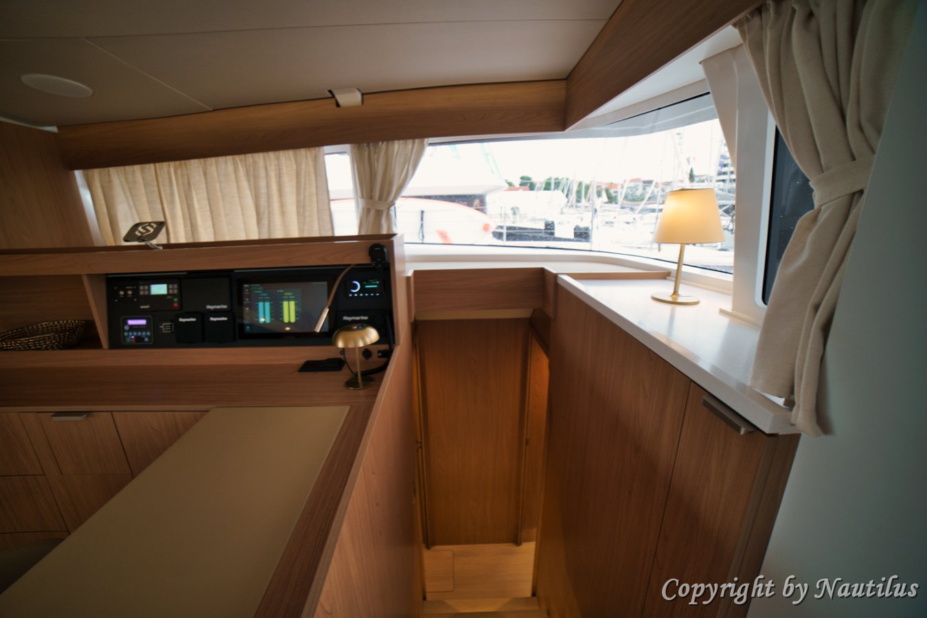 Bali-58-Fly-Salon Bali 5.8 Open Space Concept Luxury Interior Panoramic Salon Views Dining Area Relaxing Lounge Bali 5.8 Gourmet Galley Galley Layout Full-Size Fridge Navigation Station Interior Helm Cabin Access Cooking on Board Open Galley Design Evening Ambience Galley Island Forward Window Through-View Interior Design