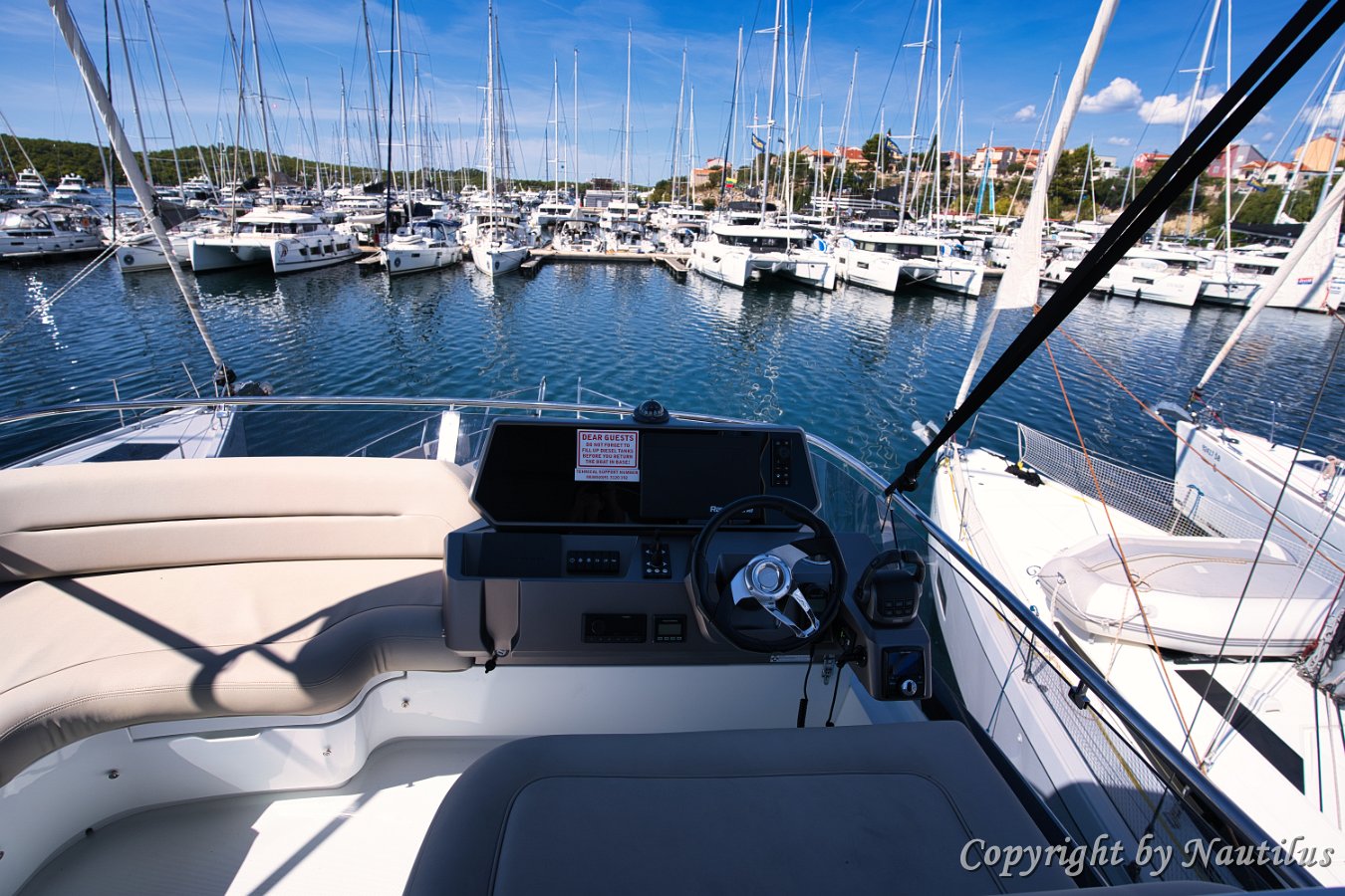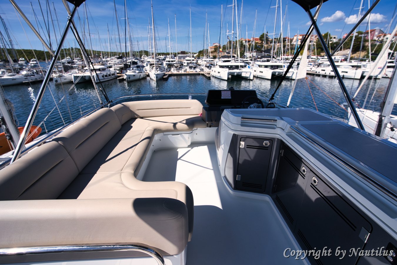 Galeon-480-Fly-Flybridge Flybridge Helm Station Alfresco Dining Shaded Relaxation Il Sogno V Flybridge Socializing on Top Galeon 480 Fly Views Spacious Layout Flybridge Lounge Luxury Above Deck Flybridge Wet Bar Galeon 480 Fly Access