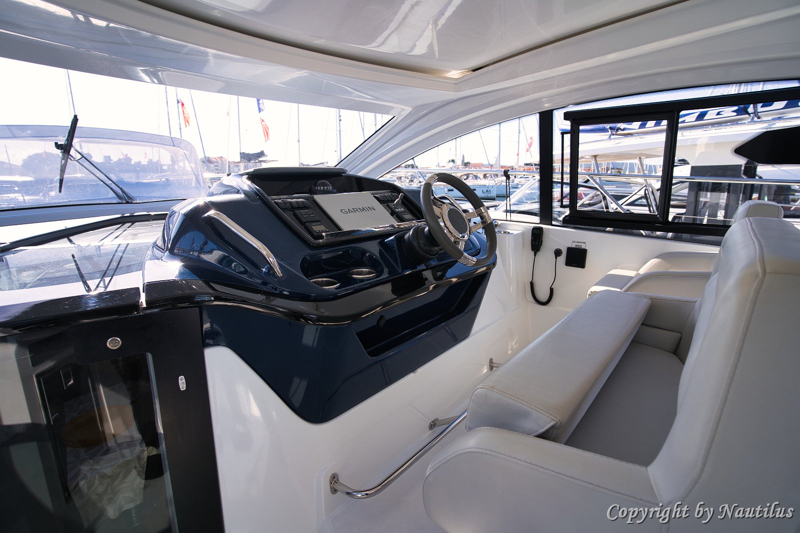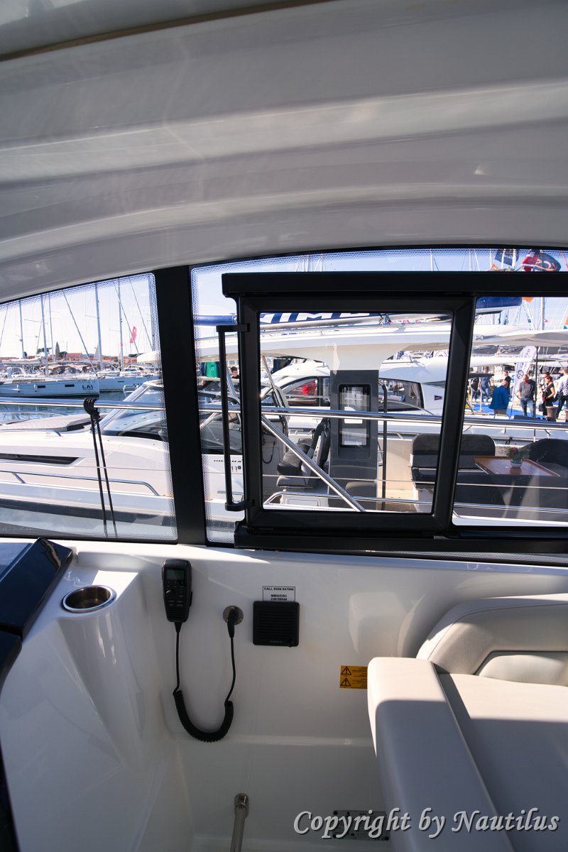Salone Superiore - 'Miami Vice' Mobile Bar in pozzetto Postazione di guida - GT 41 Finestrini laterali elettrici Dettagli tappezzeria Design sportivo timoneria Skipper al timone Sedile copilota Grill e lavello in pozzetto Ergonomia del cruscotto Vista timoneria