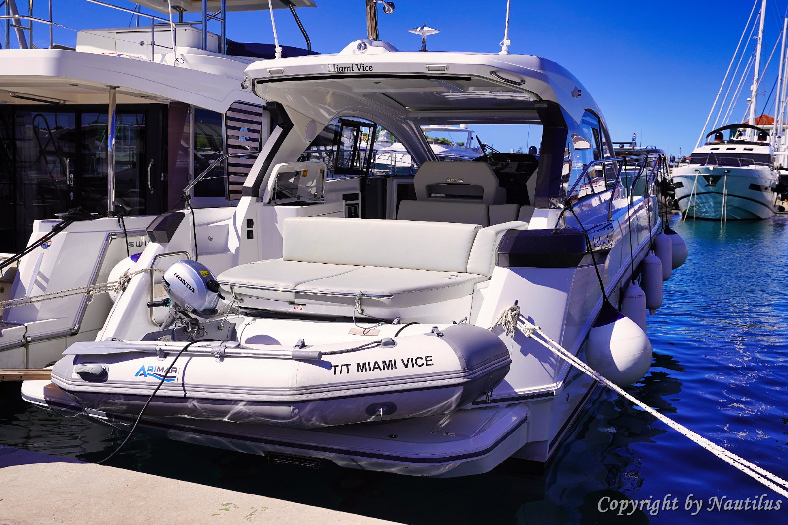Welcome Aboard 'Miami Vice' - Gran Turismo 41 Spacious Cockpit Lounge - Gran Turismo 41 Hardtop & Electric Sunroof Cockpit Dining Area Aft Sunpad Transformation Cockpit Wetbar Gran Turismo 41 Design Stern View & Swim Platform Bow View from Cockpit Social Hub Helm Station & Lounge Tender Garage / Platform Storage Foredeck Sunbathing Ready for Charter Motor Yacht 'Miami Vice' Water Sports Ready Highfield Dinghy & Honda Engine