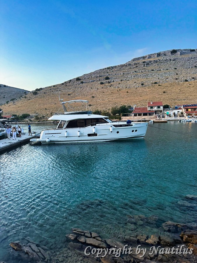 Greenline-48-Fly-At-Sea Cruising the Adriatic Wake View Bow Wave Side Deck at Sea Powerful Cruising Stern View Underway Salon with a View Anchored in Dalmatia Open Concept at Sea Cockpit Perspective Red Hot at Anchor Galley View Underway Island Hopping Sunset Cruising