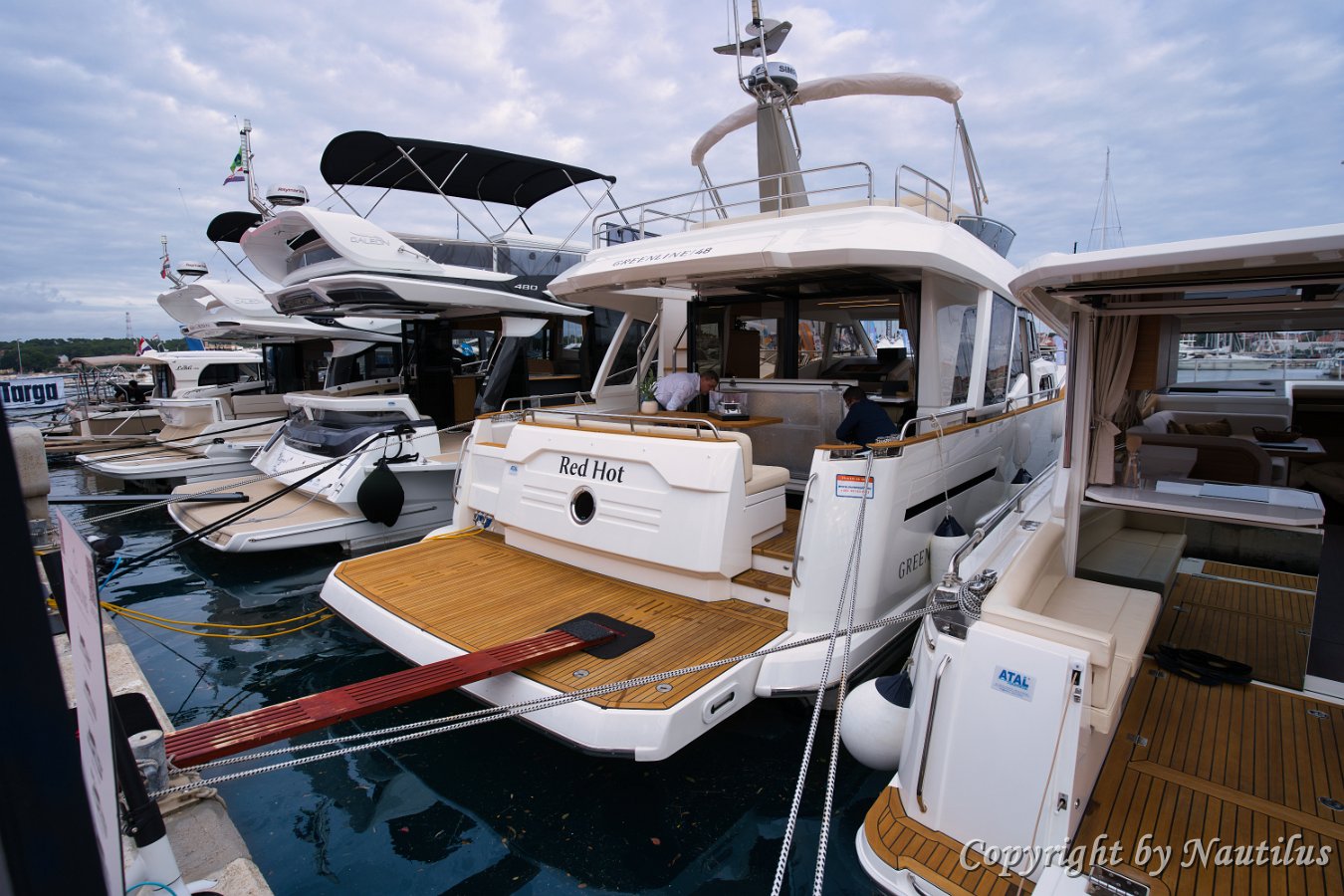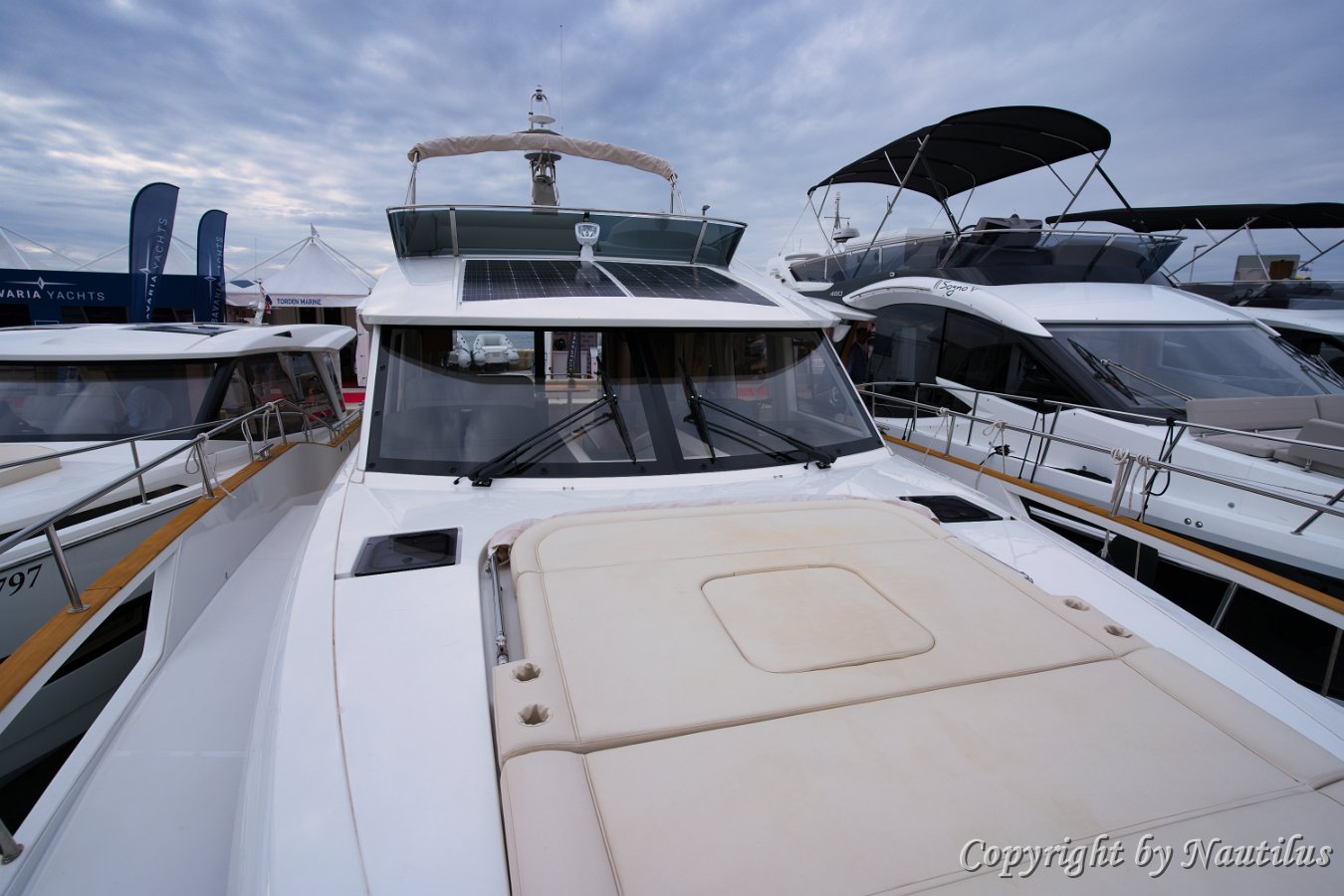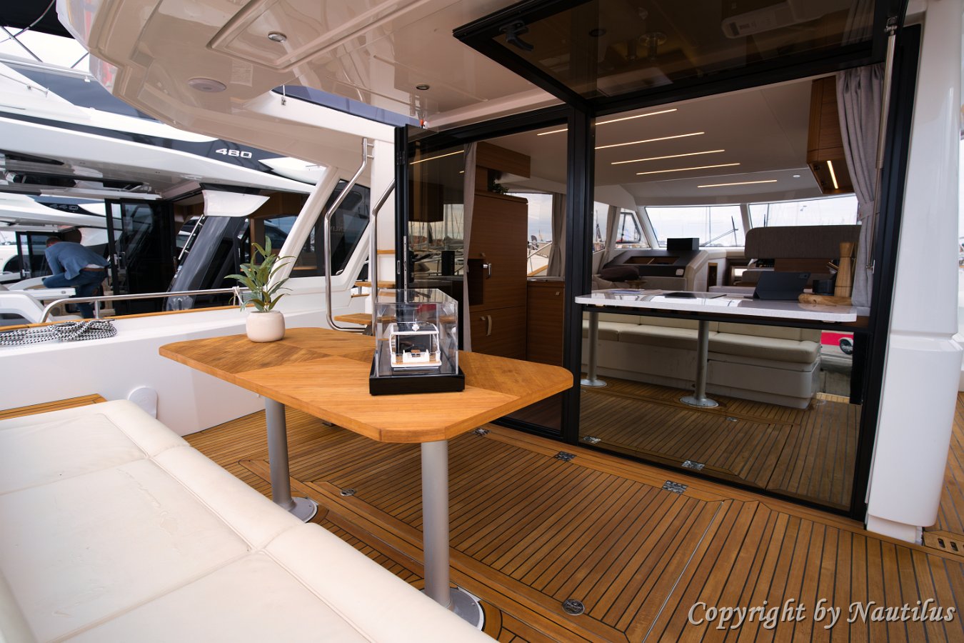Greenline-48-Fly-Deck Greenline 48 Fly Red Hot Dining on Red Hot Greenline Open Concept Flow on Red Hot Greenline Flybridge Access Greenline Walkways Teak Steps on Red Hot Red Hot Sun Lounge Greenline Solar Power Red Hot Stern Platform Greenline 48 Side View Foredeck of Red Hot Cockpit on Red Hot Greenline Cockpit Layout Socializing on Greenline 48