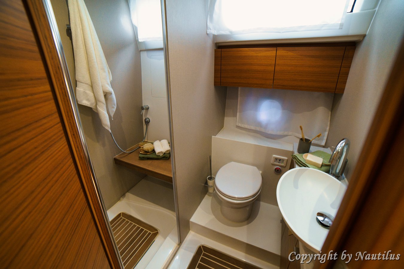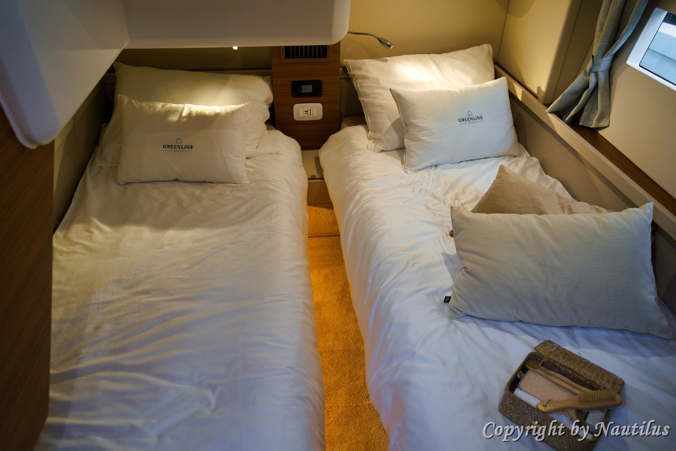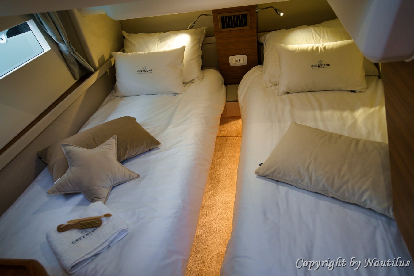 Greenline-48-Fly-Cabins Greenline 48 Master Cabin Owner's Comfort Natural Light on Greenline Master Suite Storage En-suite Bathroom Red Hot Interior Lower Deck Corridor Starboard Guest Cabin Guest Comfort Twin Cabin Layout Cabin Entry Portside Guest Cabin Greenline Accommodation Twin Beds