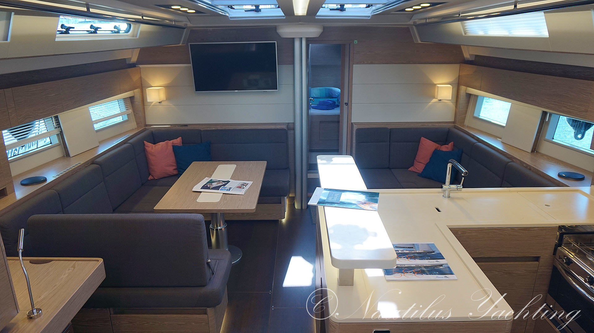 • Salon i kuhinja u središtu su života i komunikacije na brodu - ovdje se odvijaju najveselija okupljanja. Udobna velika sofa i inteligentno osvjetljenje pozivaju vas i goste da se opustite. Jednostavno lijep ambijent: uzajamno djelovanje zračenja dnevne svjetlosti i prigušena, indirektna rasvjeta, daju poseban akcent rasvjeti u salonu.