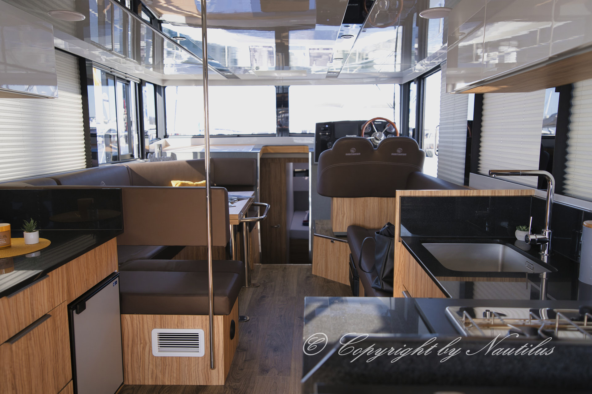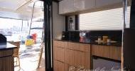 Salon: Ulaskom u salon dočekuje vas otvoren i prozračan prostor okupan prirodnim svjetlom zahvaljujući velikim prozorima i ostakljenim vratima. Dobro opremljena kuhinja, udobna blagovaonica i raskošna garnitura za sjedenje stvaraju savršeno okruženje za opuštanje i zabavu na brodu.